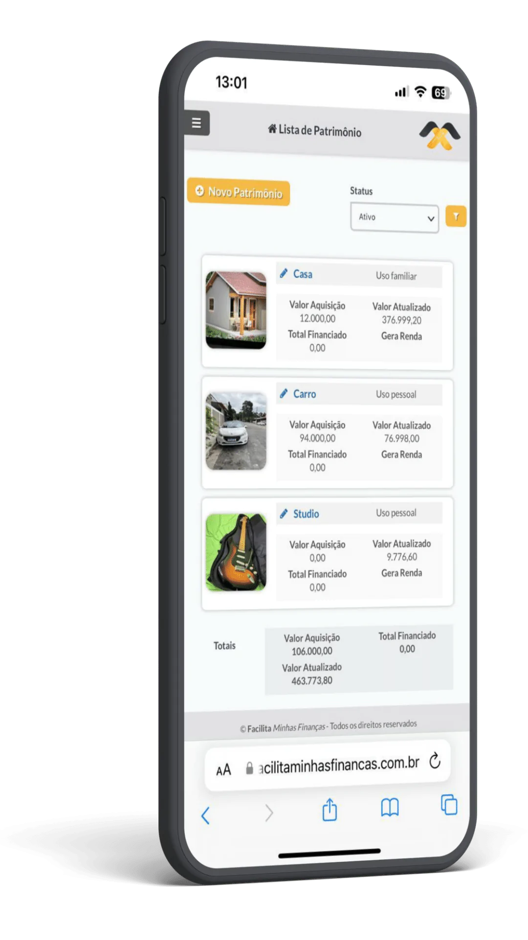 Com todas as informações patrimoniais em um só lugar, você pode fazer um planejamento financeiro mais completo, considerando não apenas seus investimentos, mas também suas propriedades, veículos, dívidas e outros ativos e passivos.